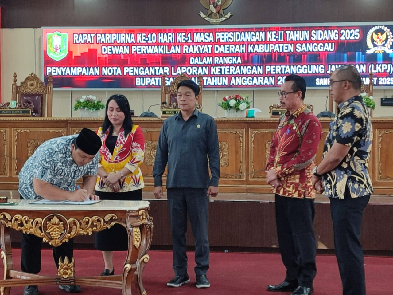 Dan diterima ketua DPRD kabupaten sanggau dan ditandatangani perihal Laporan Keterangan pertanggung jawaban (LPJ) Tahun 2024 ,di saksikan seluruh anggota DPRD dan forkopimda, beserta jajaran kepala Dinas dan tokoh masyarakat kabupaten sanggau saat penyerahan laporan keterangan pertanggung jawaban oleh wakil bupati kepada ketua DPRD kabupaten sanggau.